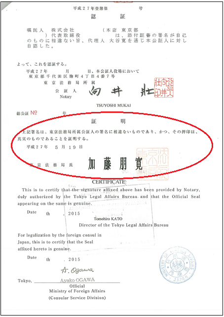 下記の画像の赤丸の枠内の「証明 上記署名は、東京法務局所属公証人の署名に相違ないものであり、かつ、その押印は真実のものであることを証明する。平成○年○月○日 東京法務局長 ○○」と書かれている箇所が法務局長の公証人押印証明になります。